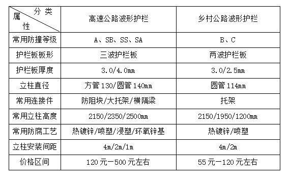要購買波形護欄,首先要了解有關波形護欄的基本信息,比如規(guī)格等級、防腐工藝、安裝方式,設置位置等等。道路波形護欄較為常用的大致可以分為高速公路波形護欄和鄉(xiāng)村公路護欄兩種。詳細情況我們可以從下表中看到: