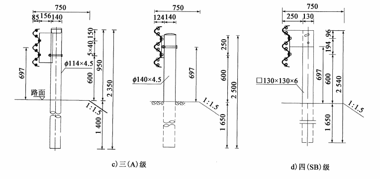 三波A級波形護欄采用的是直徑140的圓管立柱,根據路肩寬度占用距離分別采用了雙胞胎防阻塊和三波托架兩種不同的連接方式,但它們的可吸收碰撞能量都是160KJ;